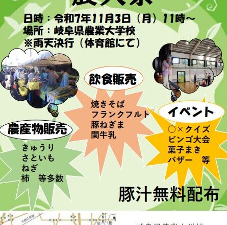 岐阜県農業大学校では、11月3日(月)に農大祭を開催します。今年は、農大で穫れた野菜、農産物、加工品の他に、飲食物として焼きそば、フランクフルト等を販売します。また、豚汁の無料配布やビンゴ大会、菓子まき等を行います。たくさんの方々にご来場頂けることを楽しみにしています!…