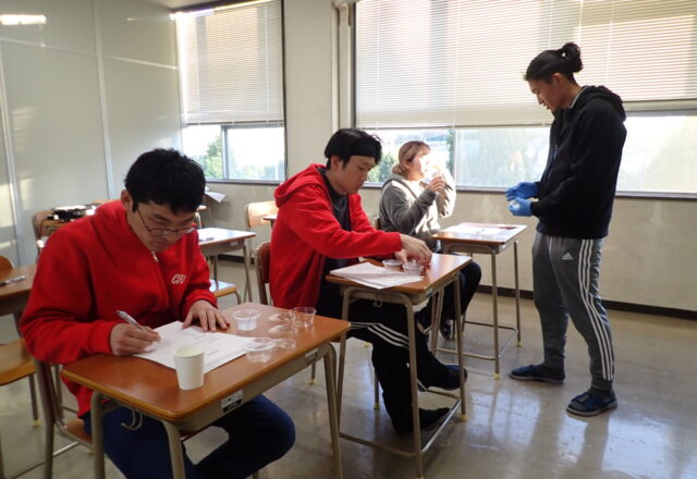 プロジェクト学習で、米ぬか給与による脂質の改善に取り組んだ肥育牛について食味官能評価試験を行いました。試験に使った肥育牛は、餌に米ぬかを5%配合した区、10%配合した区、餌に米ぬかを配合していない区の3区の肉を比較しました。牛肉は、一定の厚さと大きさになるようカットし、均一な…