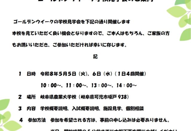 4月16日に刈払機の技能講習を1学年生20名全員が受講しました。1学年生にとって、農業大学校に入学して初めての資格取得の講習会です。当日は、各種機械講習を行っている那加クレーンセンターから講師をお招きし、刈払機の基本的な構造や点検・整備・取扱いの方法などを勉強しました。また、実技では校内…