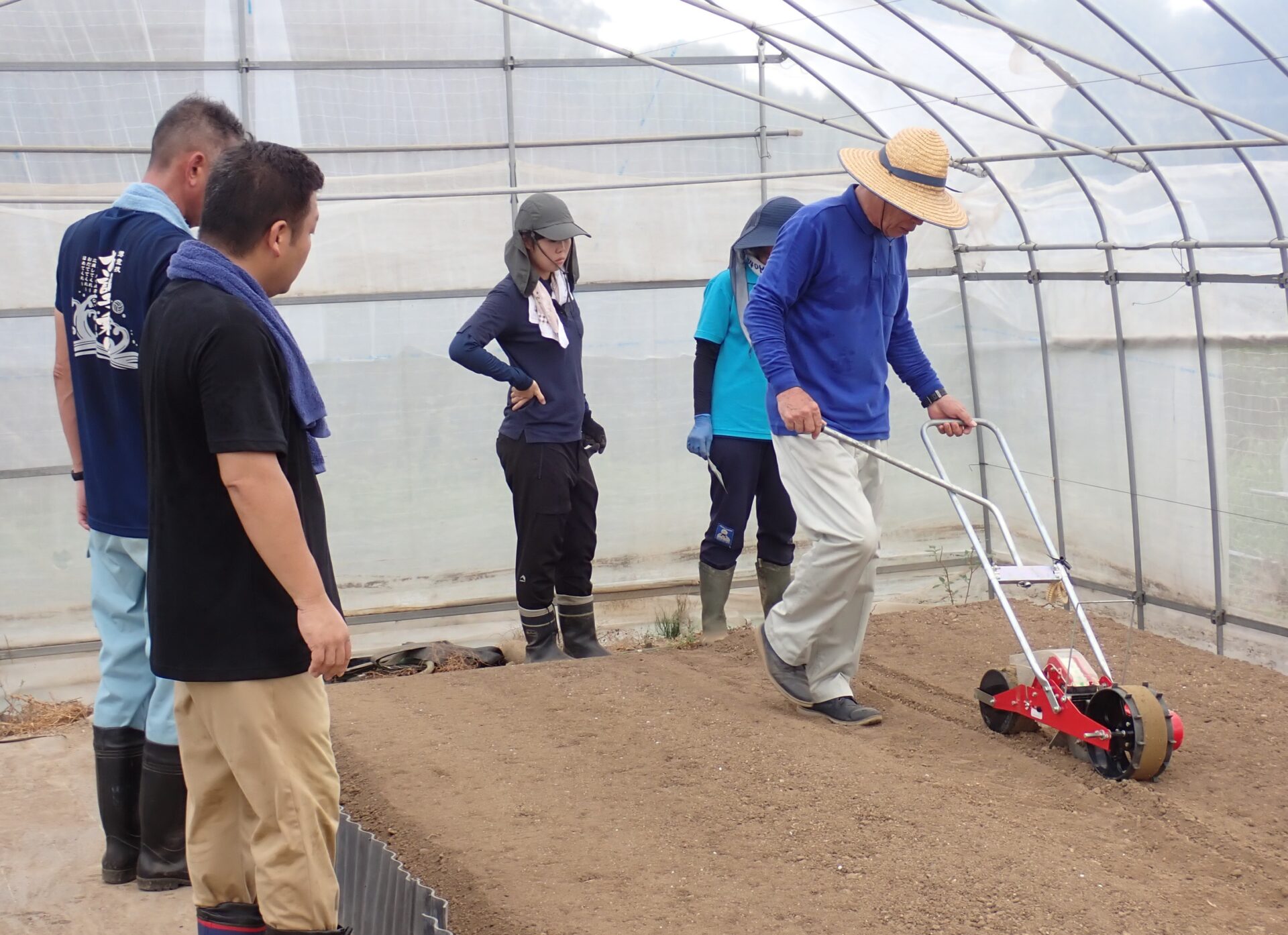 2025.09.17 ブログ 『第8回農福連携 栽培技術基礎講座』 こまつなの播種、ハクサイの定植を行いました(令和7年9月10日) 第8回の講座は、農業大学校の鷲見講師が農薬の分類などの基礎的な内容について講義しました。 実習では、ハクサイの定植とこまつなの播種を行いました。こまつなはハウス内で直接播種するので、播種機を使って交代で慎重に播きました。自分が播種した列の結果が心配な様子でした。 次回は、今回播種したこまつなの収穫と出荷調製、5月に定植したさつまいもの収穫を行う予定です。