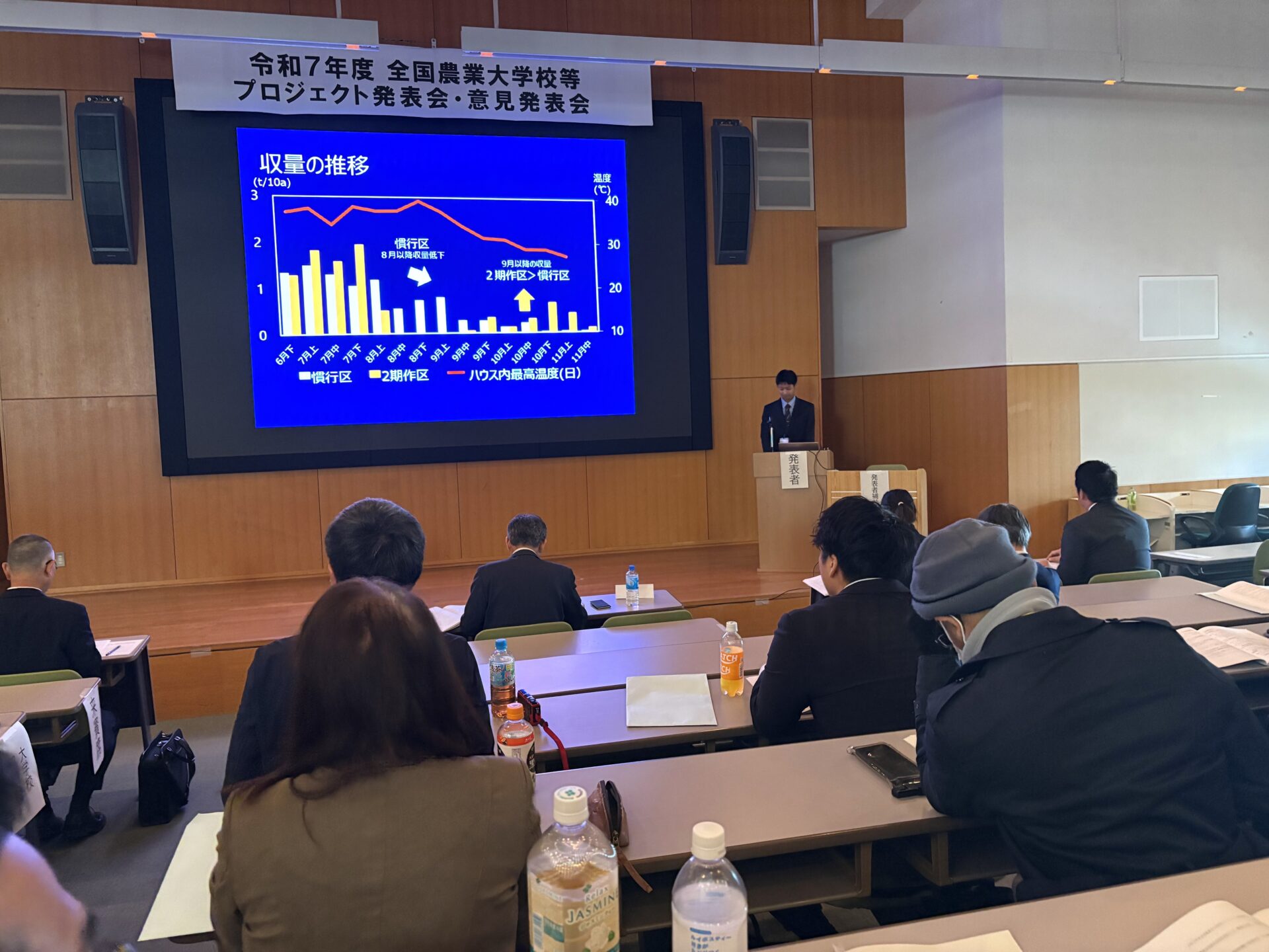 本校からは、東海近畿ブロックの大会で最優秀賞を受賞した野菜専攻2学年の福井さんが、「夏秋トマト栽培における高温期の作業負担軽減技術」と題して、プロジェクト発表部門で研究の成果を発表しました。