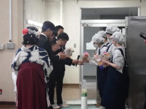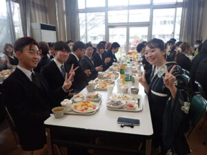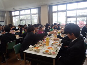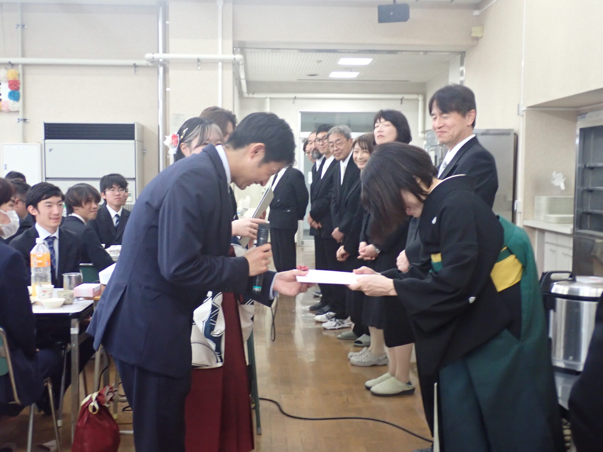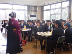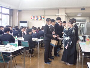 2026.03.24 ブログ 卒業を祝う会を行いました(令和8年3月3日) 3月3日の卒業式後に、在校生・卒業生・卒業生の保護者・職員・土生会(農業大学校OB・OG会)の方が当校食堂に集まり、卒業生を祝う会を開催しました。 会では、土生会の方、在校生から卒業生へお祝いの言葉が送られた後、卒業生一人一人が、卒業後の進路に向けた抱負について話し、在校生が卒業生に贈り物をしました。 その後、卒業生がお世話になった職員に色紙や、花束を贈り、笑顔溢れる素敵な会となりました。