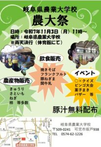 2025.10.21 トピックス 『農大祭』を開催します! 岐阜県農業大学校では、11月3日(月)に農大祭を開催します。 今年は、農大で穫れた野菜、農産物、加工品の他に、飲食物として焼きそば、フランクフルト等を販売します。 また、豚汁の無料配布やビンゴ大会、菓子まき等を行います。 たくさんの方々にご来場頂けることを楽しみにしています!